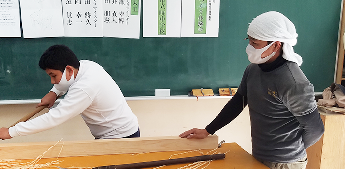 厚生労働省認定 ものづくりマイスターを活かし、小中学校で大工の授業を行っています。